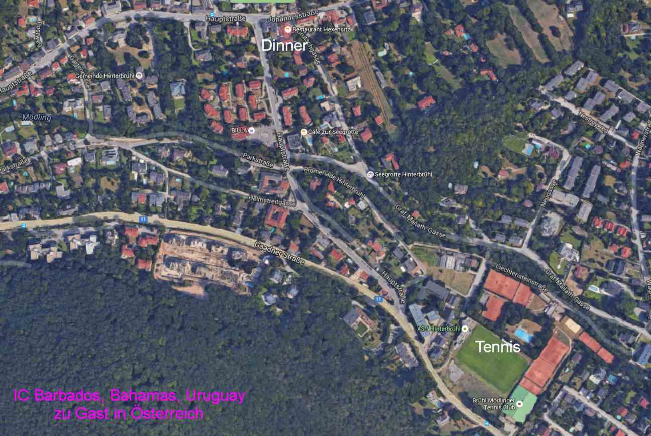 Am 13. und 14. Juni hatten wir IC Bahamas, IC Barbados und IC Uruguay in Österreich zu Gast. Auf der wunderschönen Anlage des BMTC in der Hinterbrühl wurden bei herrlichem Tenniswetter freundschaftliche aber doch spannende und interessante Matches ausgetragen. Auch eine Besichtigungsfahrt nach Wien wurde den Gästen geboten. Der Festabend mit insgesamt 58 Personen fand im Restaurant "Hexensitz" statt. Für die musikalische Umrahmung sorgte dankenswerterweise Werner Kerschbaum mit seinem Musikfreund Wolfgang Schedl. Das alles wurde in bewährter Weise organsisiert von Anne-Marie und Peter Lund. Bei dieser Teilnehmerzahl war es eine besondere Herausforderung die souverän bewältigt wurde.
